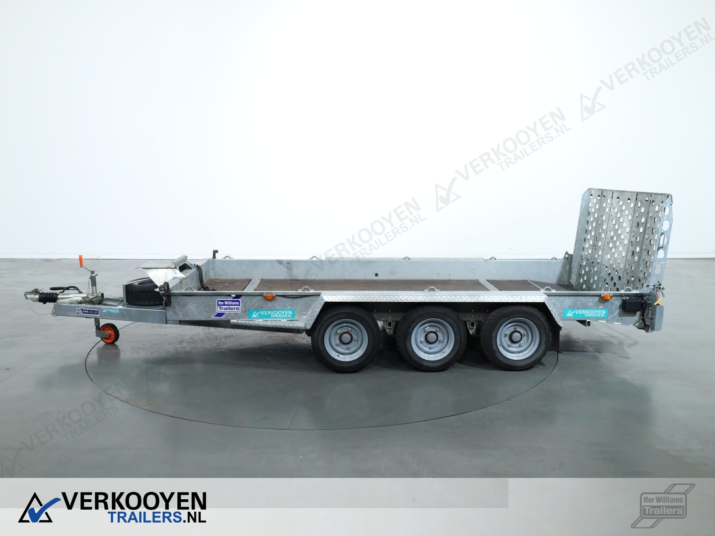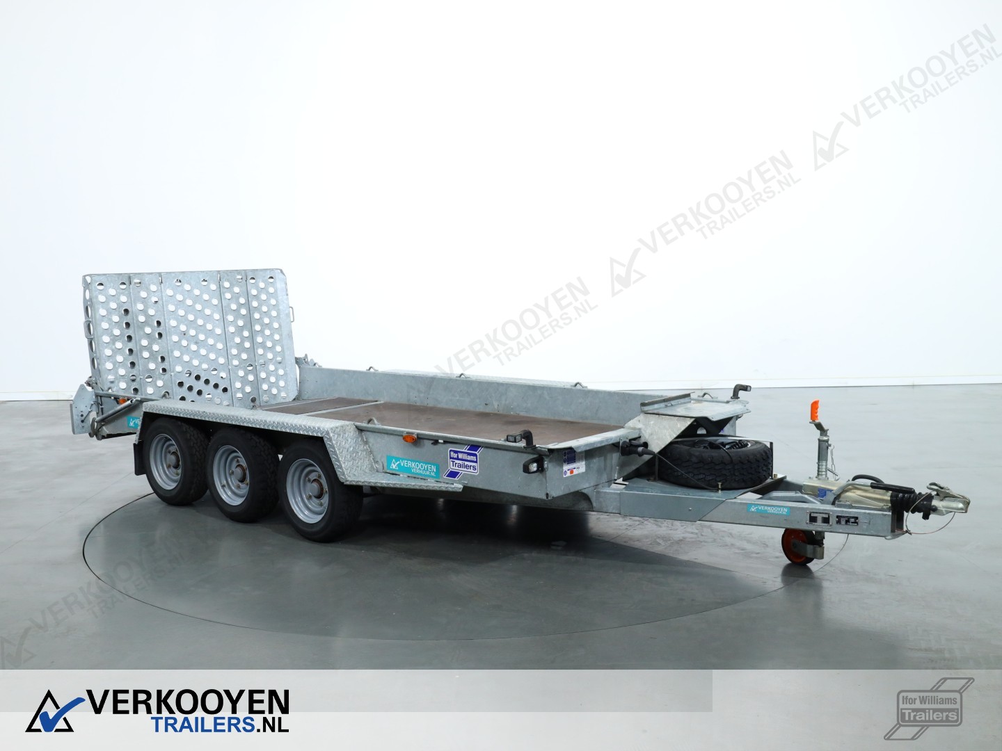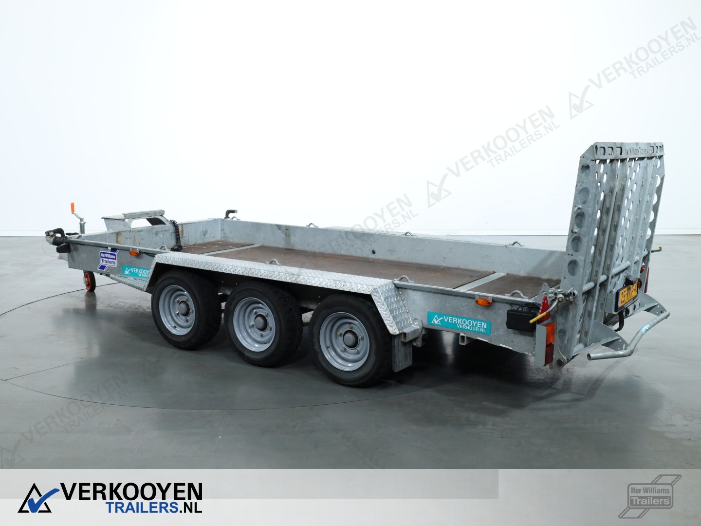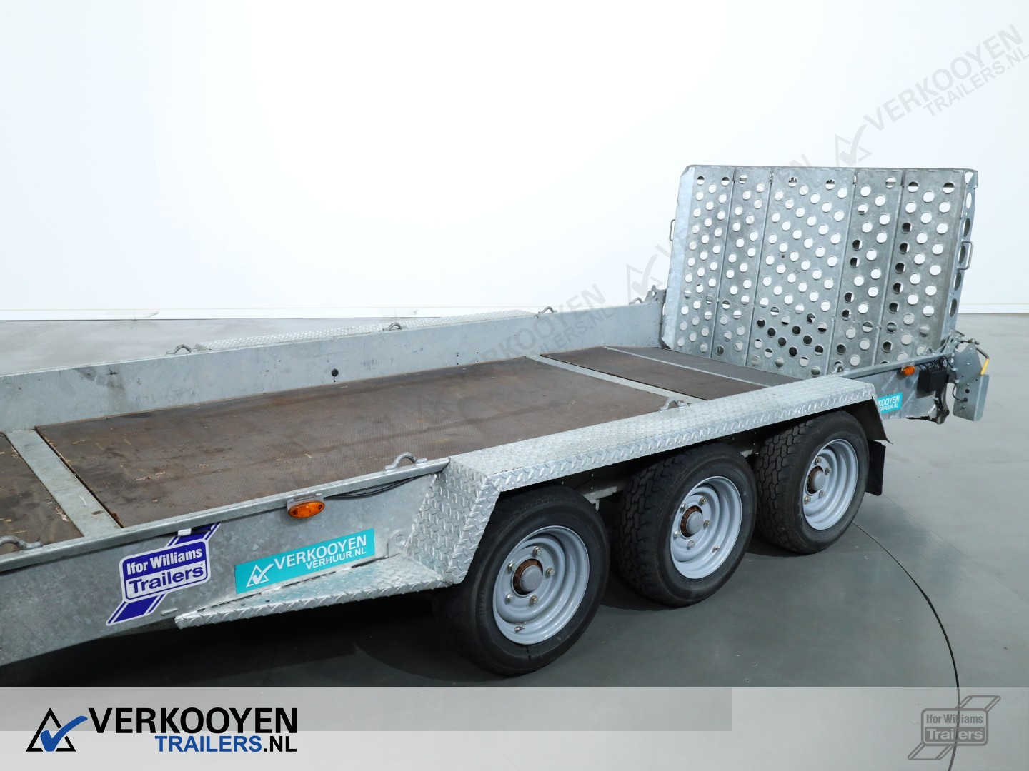 Ifor Williams GH146 machinetransporter. Deze Ifor Williams GH146 3-assige machinetransporter is uitgevoerd met bladgeveerde assen en heeft een maximaal draagvermogen van 3500 kg